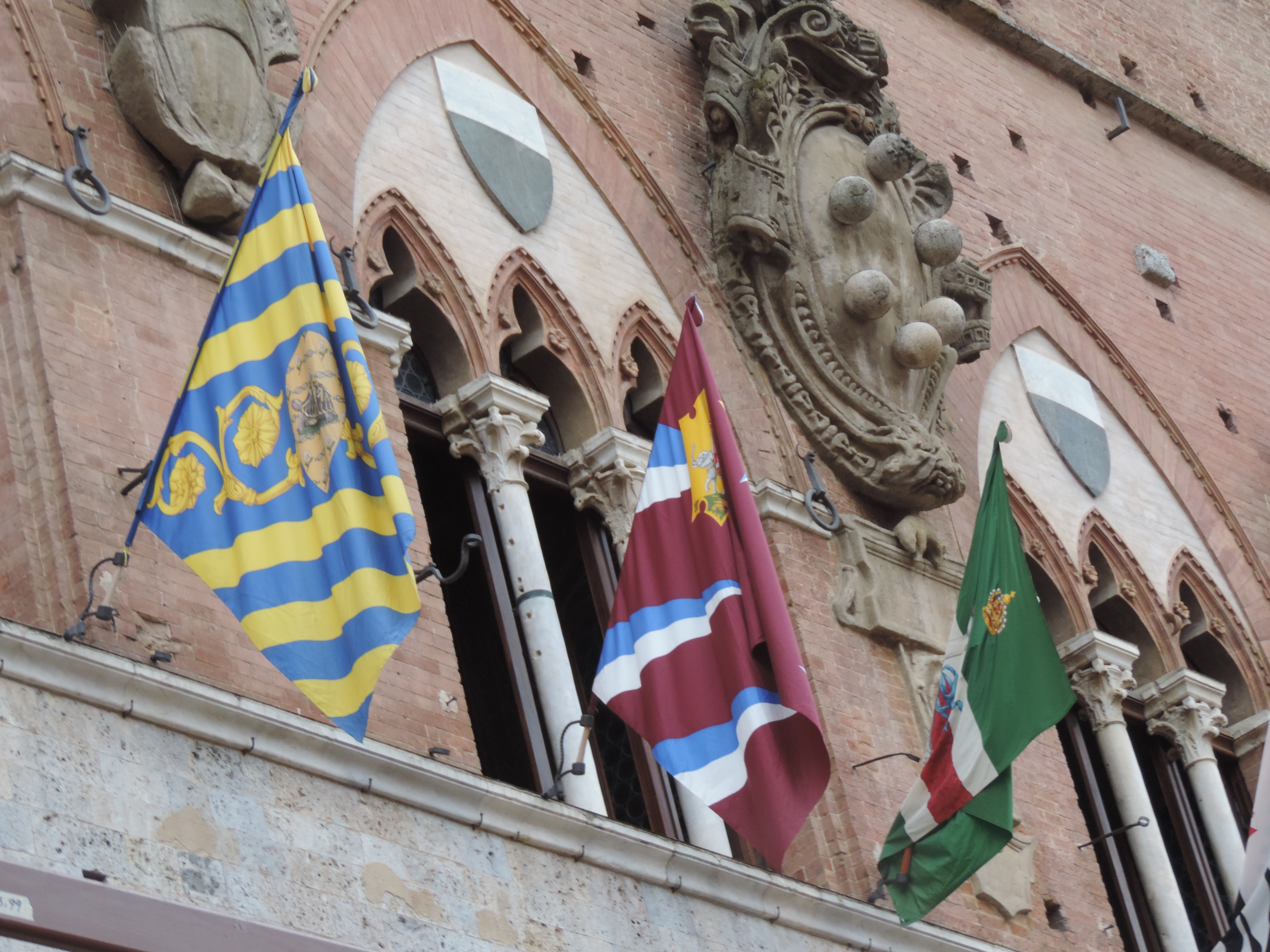 Contade flags mounted on Plazzo Pubblico ready for the Palio